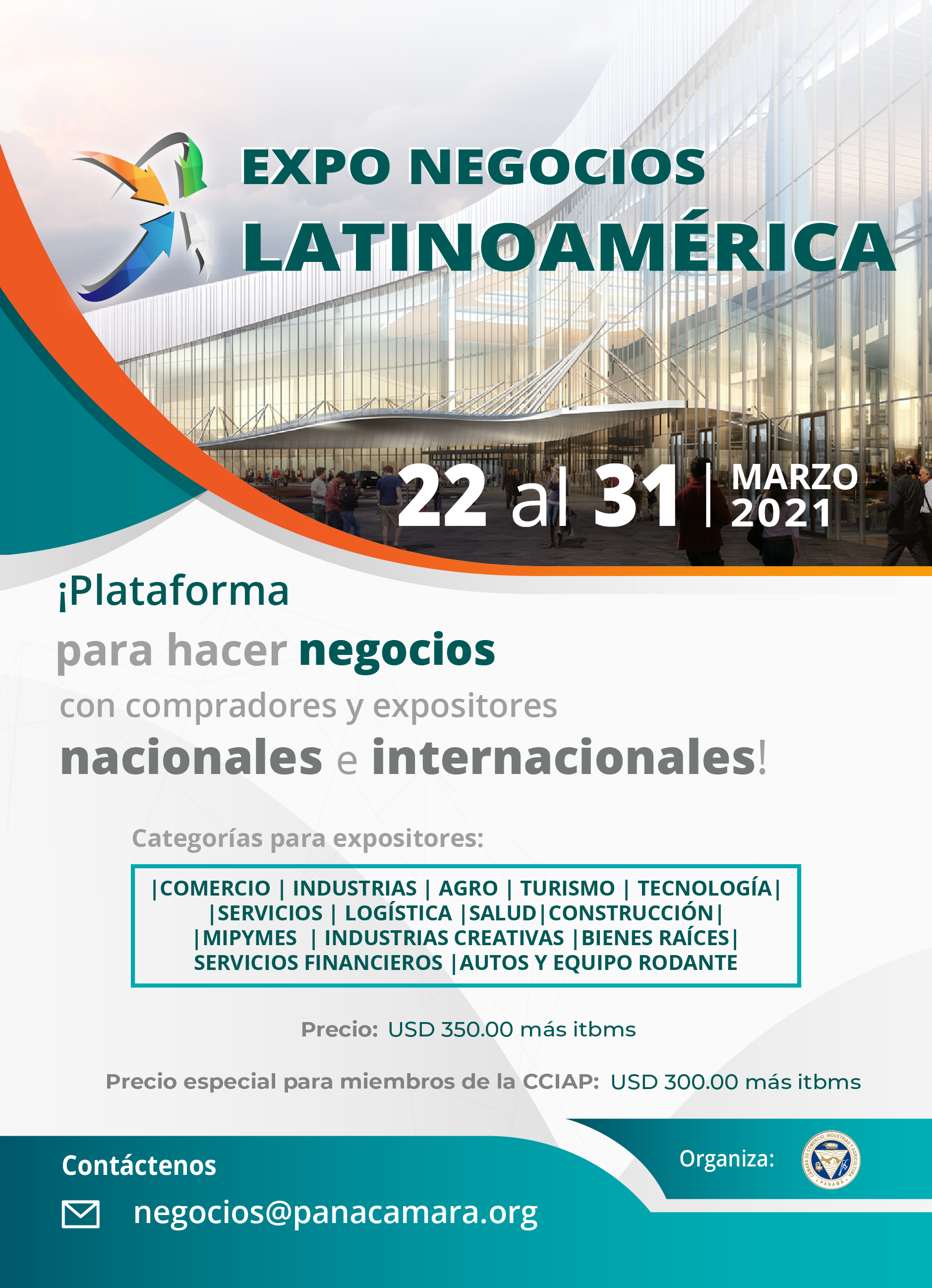 La Cámara de Comercio, Industrias y Agricultura de Panamá (CCIAP), con el objetivo de contribuir con la re-activación de la actividad comercial, organiza EXPO NEGOCIOS LATINOAMÉRICA, que se llevará a cabo del 22 al 31 de marzo de 2021.